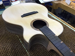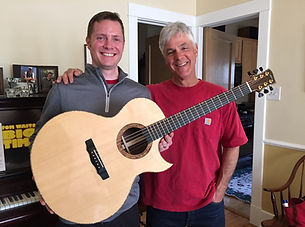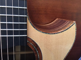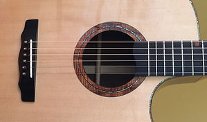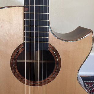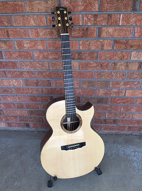 The Josh-185, modeled after the famous Gibson J-185, has a jumbo-size lower bout, a narrow waist and upper bout, and a florentine cutaway. It has the classic Gibson 24.75" scale length. Rosewood back/sides, master grade Sitka Spruce soundboard, Honduran Mahogany neck with ebony fingerboard. Koa bindings with abalone Zipflex purfling, custom edge-style fret markers, Gotoh gold 510 tuners, ebony bridge. This guitar is also fitted with a K&K Pure Mini pickup. It has a big "jumbo" sound and is a spectacular looking instrument.